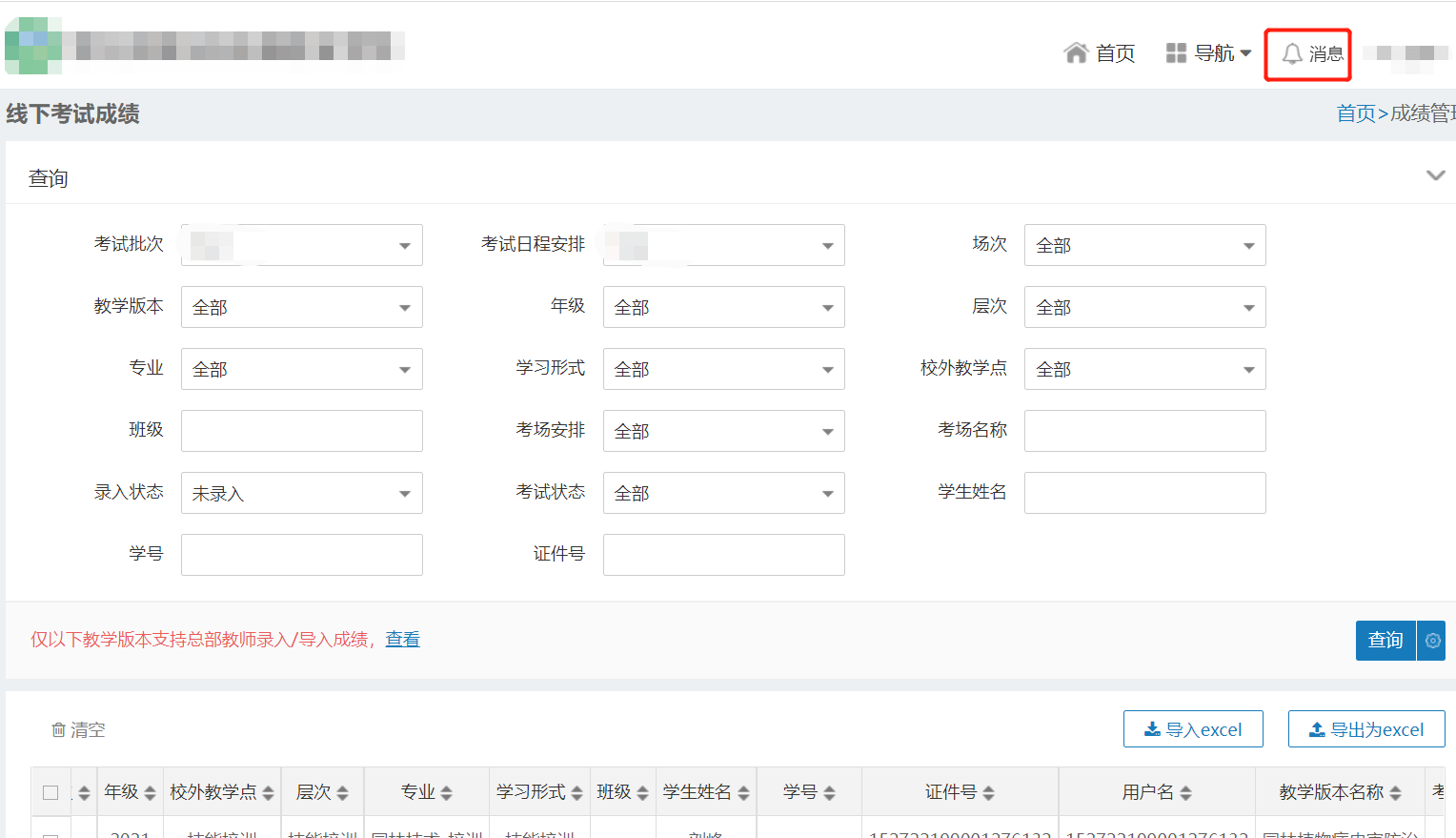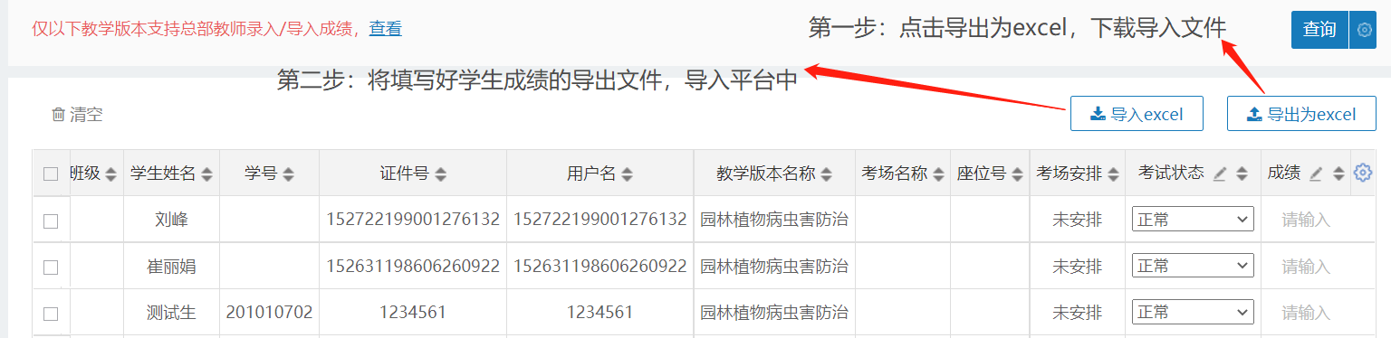 第二種:點擊導(dǎo)出為excel,把學(xué)生信息導(dǎo)出。在導(dǎo)出的文件中輸入學(xué)生成績,然后點擊導(dǎo)入excel,把剛才填好學(xué)生成績的導(dǎo)出文件,導(dǎo)入到系統(tǒng)即可。