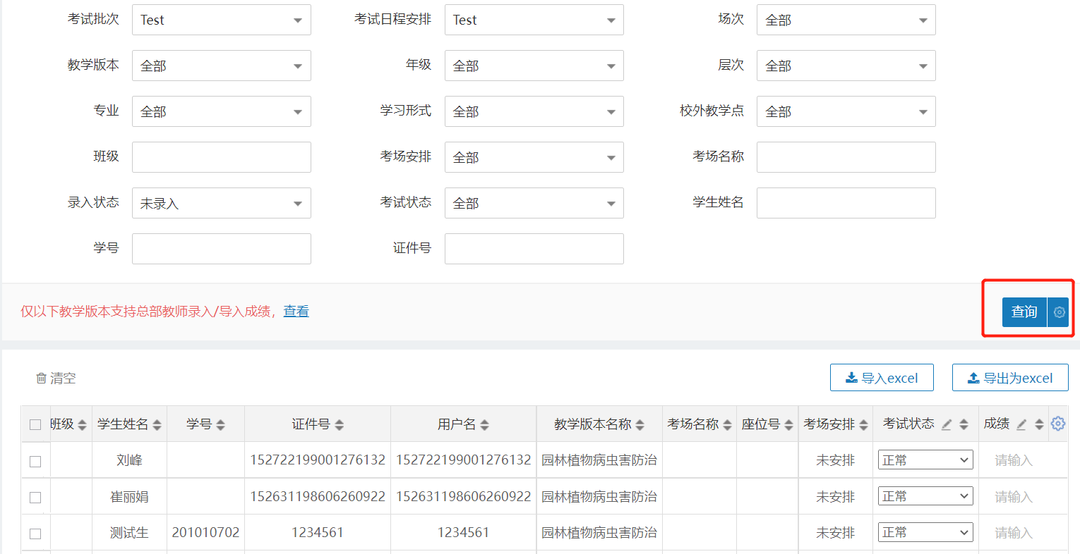 在查詢框中篩選出需要錄入成績的學(xué)生信息,點擊查詢按鈕。下方會出現(xiàn)學(xué)生列表。