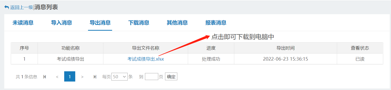 點擊確定后,在消息模塊,點擊導(dǎo)出文件,點擊文件名稱即可下載導(dǎo)出文件。
